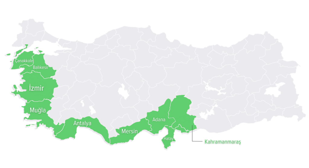 Proje, öncelikli hedef bölgeler olarak tespit edilen ve Adana, Antalya, Aydın, Balıkesir, Çanakkale, Gaziantep, Hatay, İzmir, Kahramanmaraş, Kilis, Manisa, Mersin, Muğla ve Osmaniye illerini kapsayan Adana, Antalya, Balıkesir, Çanakkale, Hatay, İzmir, Kahramanmaraş, Mersin ve Muğla Orman Bölge Müdürlüklerinde uygulanacaktır.